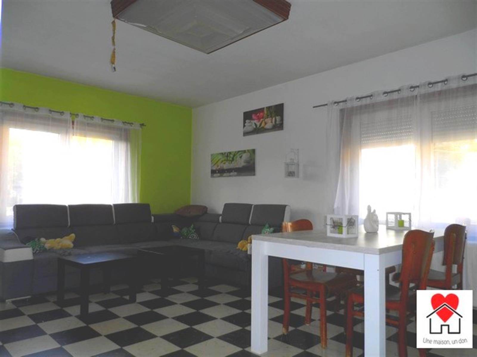 Elle se compose au rez-de-chaussée d'un hall d'entrée, d'une cuisine semi-équipée, un living, une salle de bains et deux chambres. L'étage accessible par un escalier fixe comprend un grenier aménageable (2 chambres déjà pré-aménagées).